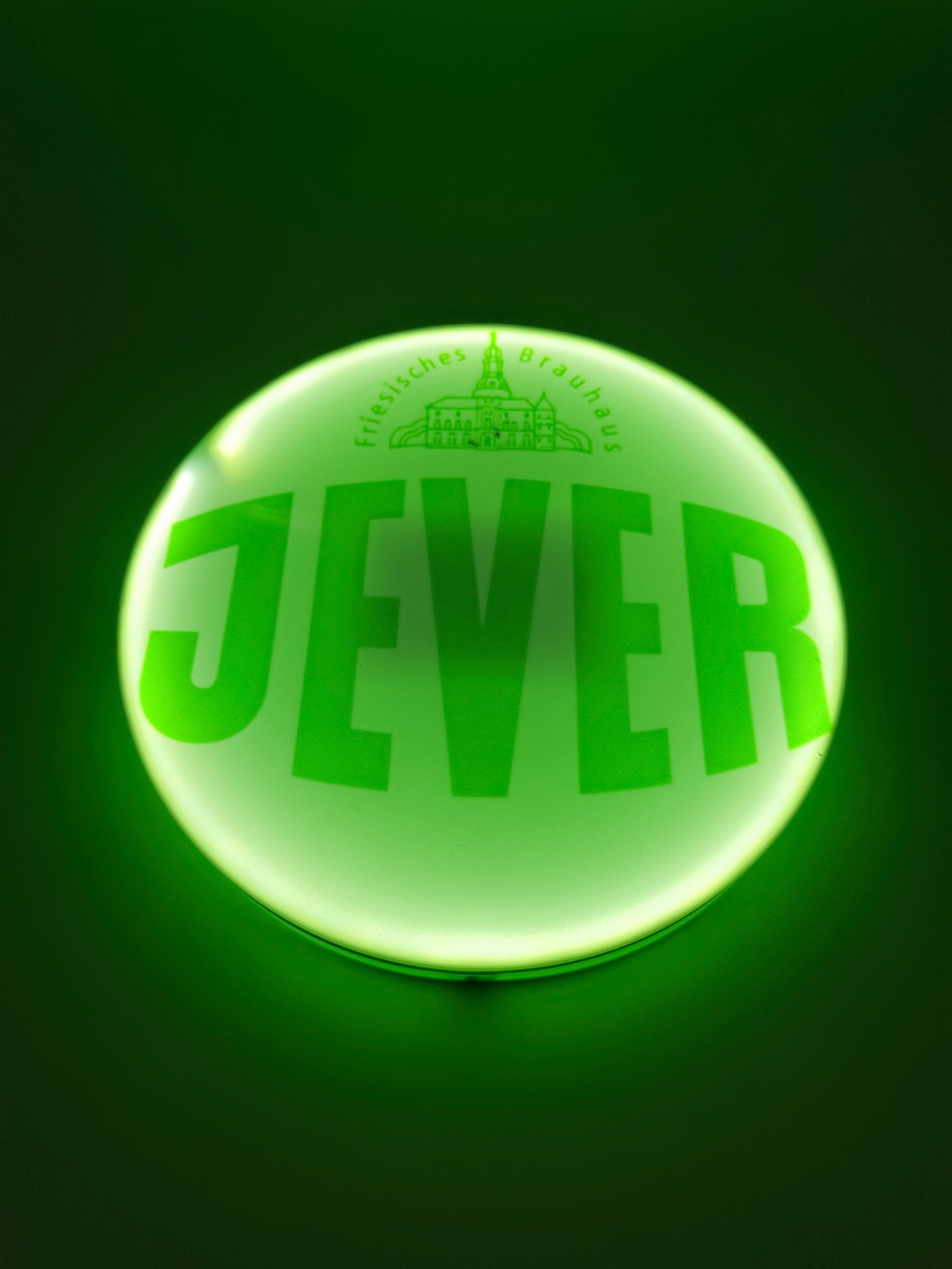 Das Jever-Logo wird aus umweltfreundlichem 3D-Druckmaterial gefertigt und von innen klar und gleichmäßig beleuchtet.